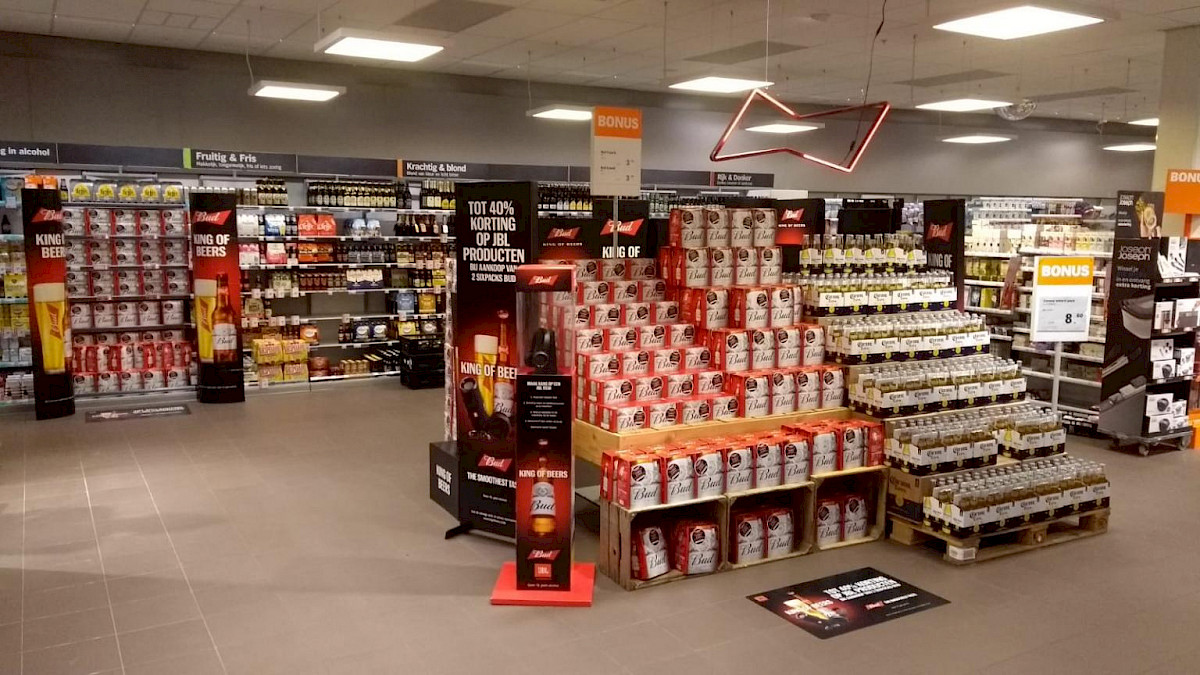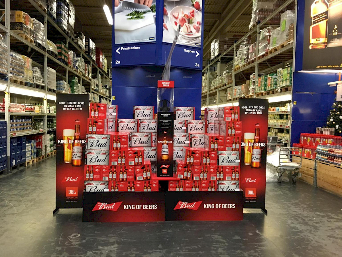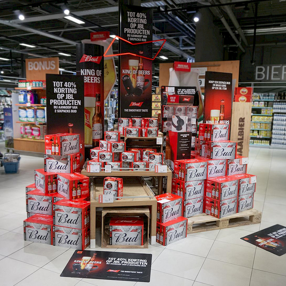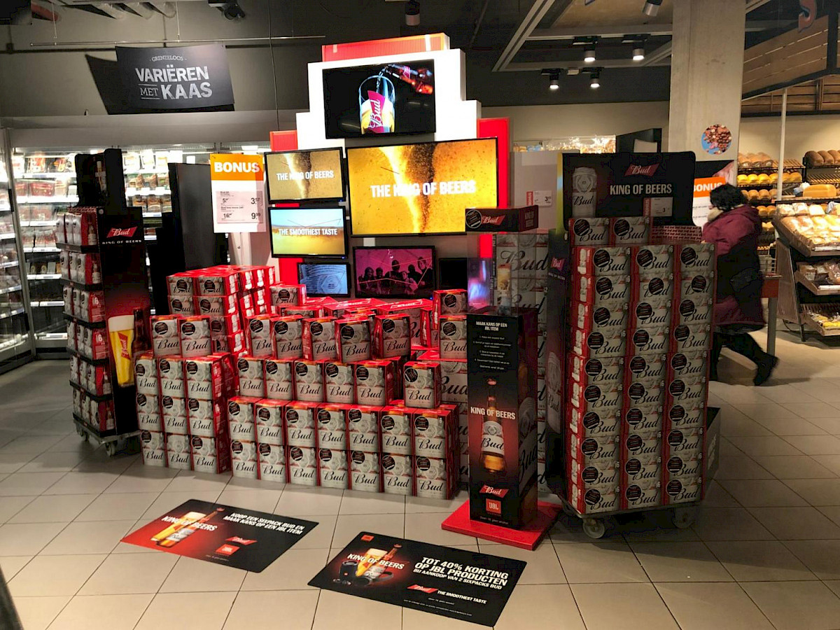 Des présentoirs de formes et de tailles diverses ont été utilisés pour attirer l'attention sur la bière américaine. Des présentoirs au sol et sur palette aux colonnes et ellipses. Le tout dans un seul et même style, ce qui signifie qu'il a un grand impact sur le terrain ! Jugez par vous-même....